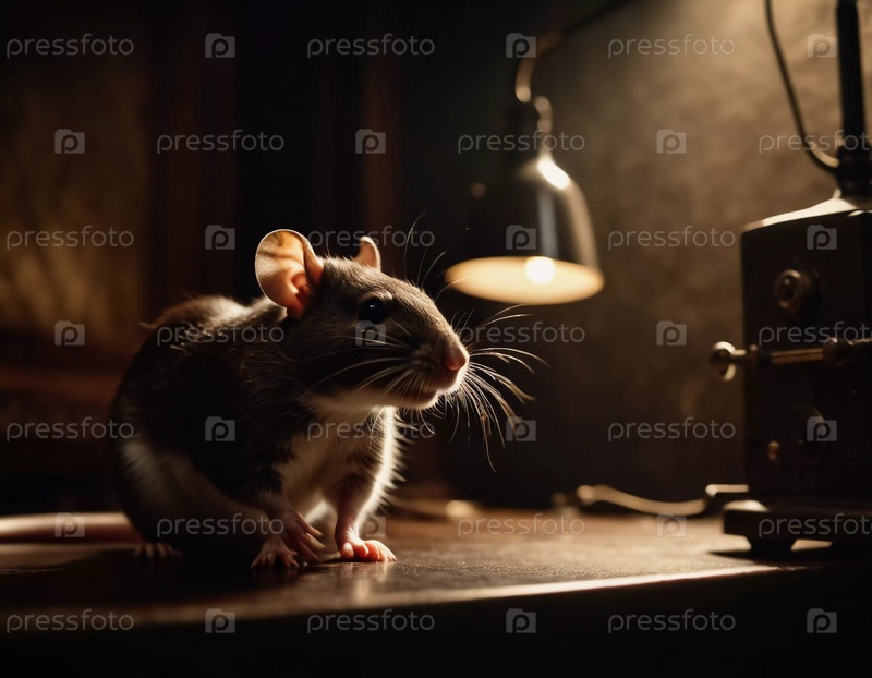 Маленькая крыса плавает в тенистом пространстве, освещенном мерцающей лампой. Усики дергаются, когда исследуют окрестности в поздние часы. Страшный вампир или атмосфера Хэллоуина. Генерирующий ИИ