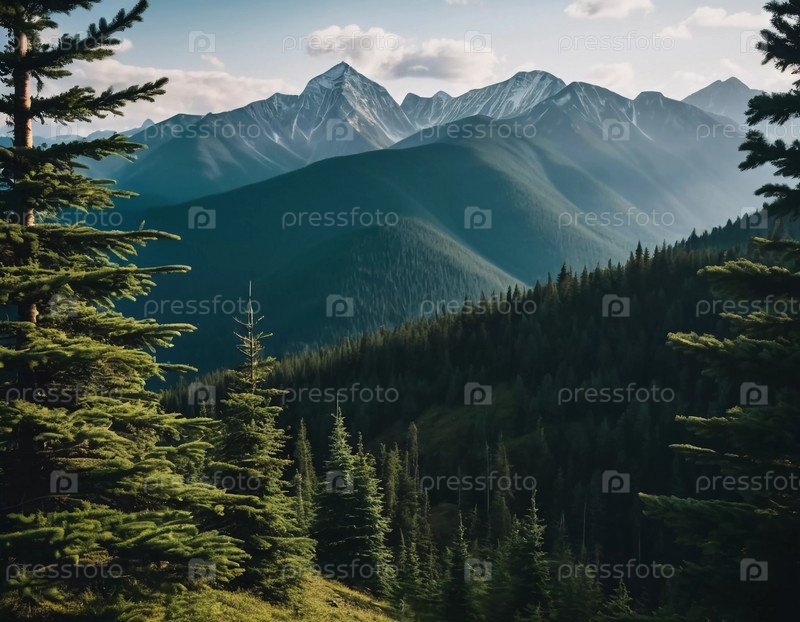 Величественные горы возвышаются над безмятежным еловым лесом под драматическим небом, демонстрируя красоту природы в сумерках. Высокие горы с холмами и угрюмым небом, освещающим мирную пустыню. ИИ