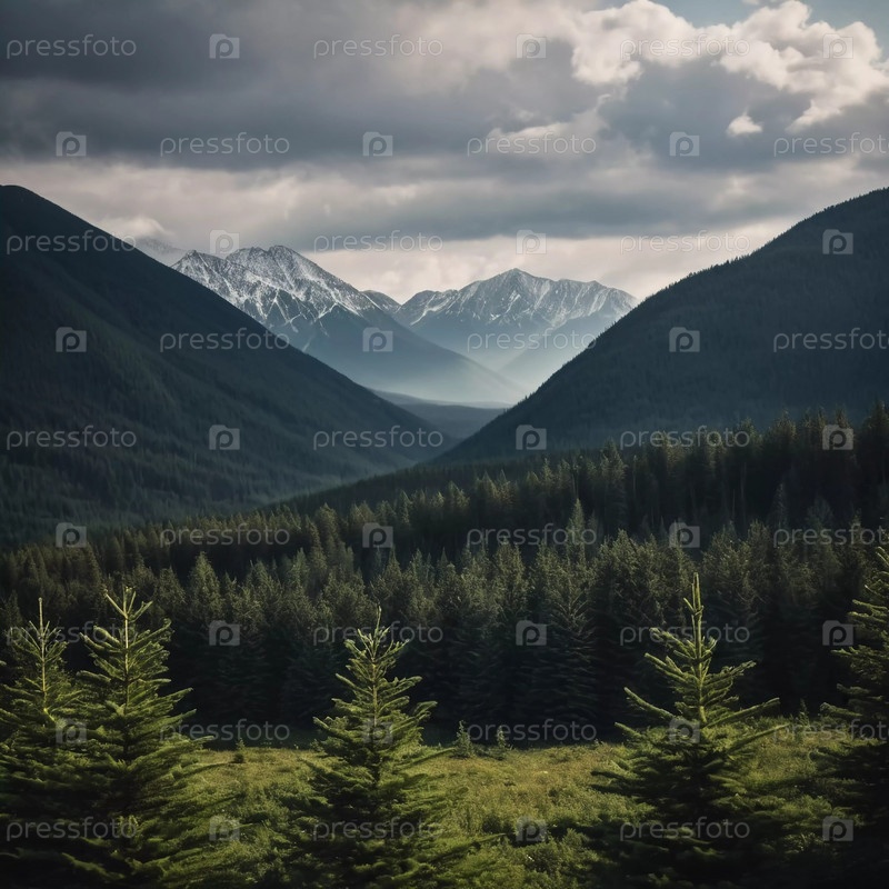 Величественные горы возвышаются над безмятежным еловым лесом под драматическим небом, демонстрируя красоту природы в сумерках. Высокие горы с холмами и угрюмым небом, освещающим мирную пустыню. ИИ