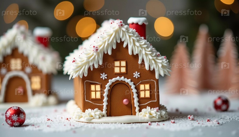 Очаровательный пряничный дом со снежной крышей сидит на тарелке, окруженный праздничными украшениями, захватывая дух праздника. Белый сладкий сливочный крем. Новый год, рождественское украшение. Генерирующий ИИ