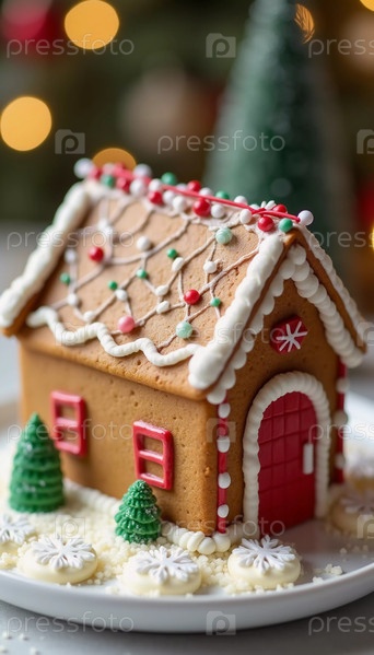 Очаровательный пряничный дом со снежной крышей сидит на тарелке, окруженный праздничными украшениями, захватывая дух праздника. Белый сладкий сливочный крем. Новый год, рождественское украшение. Генерирующий ИИ