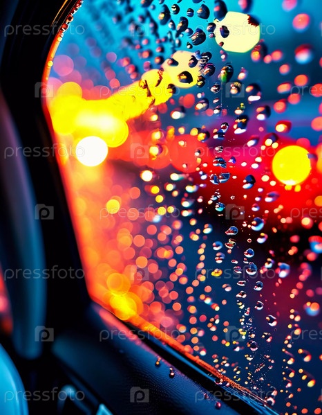 Капли дождя цепляются за поверхность автомобильного стекла, искажая яркий городской пейзаж вечером, где красочные огни от движения и зданий сливаются в красивый дисплей. Генерирующий ИИ