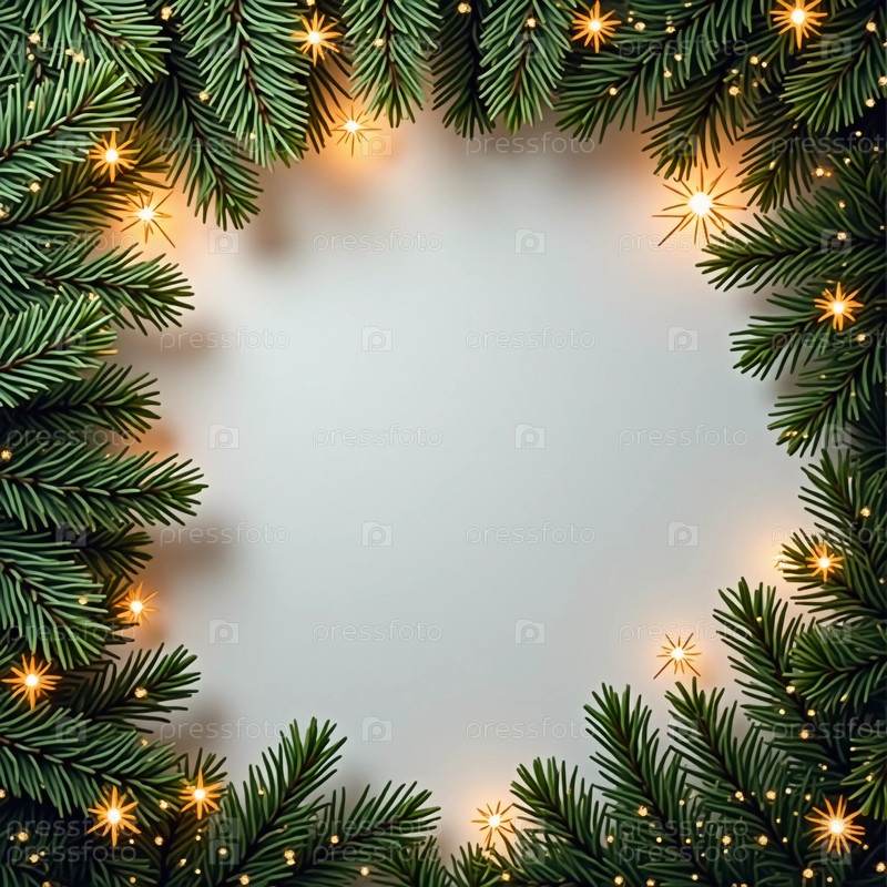 Ветви елки создают праздничную границу, с разбросанными золотыми звездами и огнями, усиливая радостную атмосферу празднования Рождества и Нового года, вызывая тепло и веселье. Генерирующий ИИ