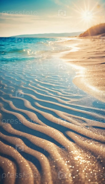 Волны мягко примыкают к песчаному берегу, создавая красивые узоры, сверкающие на солнечном свете. Этот спокойный летний пляж предлагает отдых и наслаждение красотой природы. Генеративный ИИ