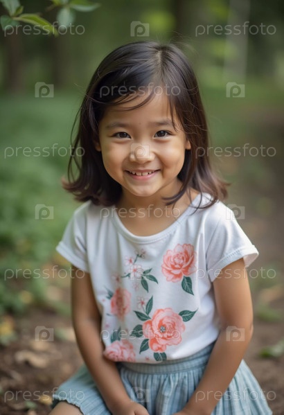 Веселая девушка в цветочной рубашке сидит на тропинке в окружении пышной зелени в Таиланде. Ее яркая улыбка отражает радость игры на открытом воздухе и изучения природы. Генерирующий ИИ