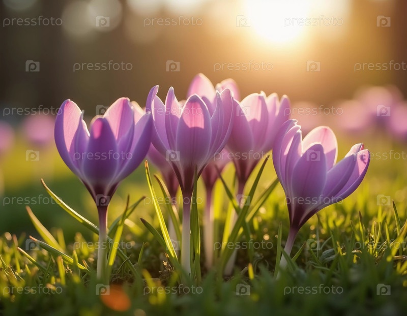 Нежные розовые цветки крокуса цветут в пышной зеленой траве, солнечный свет в спокойной весенней обстановке. Возрождение природы. Шафран Крокус является род многолетних луковичных травянистых растений семейства Iris Iridaceae