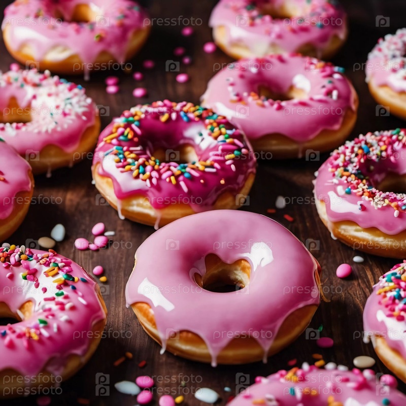 Восхитительные клубничные розовые глазурованные пончики отображаются на деревенском деревянном фоне. Посыпки и конфетные украшения добавляют яркие цвета, создавая праздничное угощение. Генерирующий ИИ