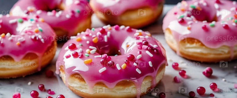 Восхитительные клубничные розовые глазурованные пончики отображаются на деревенском деревянном фоне. Посыпки и конфетные украшения добавляют яркие цвета, создавая праздничное угощение. Генерирующий ИИ
