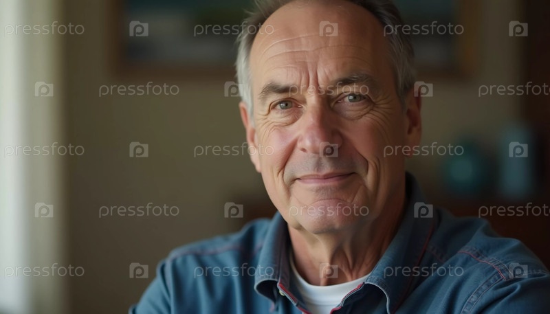 Зрелый мужчина с седыми волосами, житель США, мягко улыбается. Теплое освещение создает уютную атмосферу. Спокойный, уверенный взгляд. Опыт, профессионализм и интеллект в глазах. Генеративный ИИ