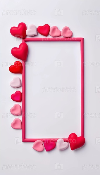 Декоративные сердца различных размеров в красном, розовом и белом создают игривую рамку вокруг пустого белого пространства, идеально подходящую для личных заметок или романтических сообщений для особых случаев. Генеративный ИИ