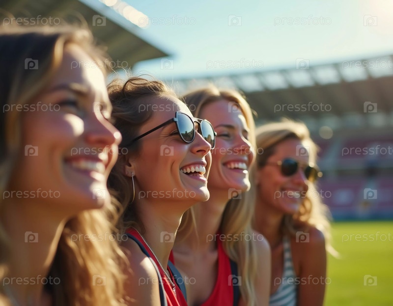 Четыре друга греются под теплым солнечным светом, делясь смехом и радостью на оживленном спортивном стадионе, создавая заветные воспоминания вместе в прекрасный день