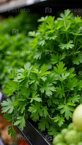 Пышный показ петрушки и сельдерея отражает суть свежести в оживленном супермаркете. Покупателей привлекает богатая зелень, усиливая их кулинарное вдохновение