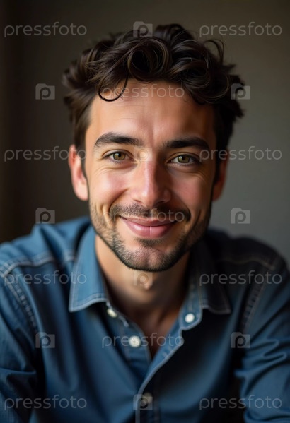 Под мягким освещением веселый молодой человек с вьющимися волосами и яркими глазами тепло улыбается. Его повседневная джинсовая рубашка предлагает расслабленную атмосферу и приглашает к общению