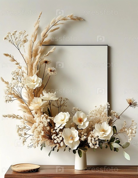 Нежная белая гипсофила и другие земные элементы создают потрясающее цветочное расположение рядом с гладким зеркалом, идеально подходит для добавления спокойствия в любое внутреннее пространство