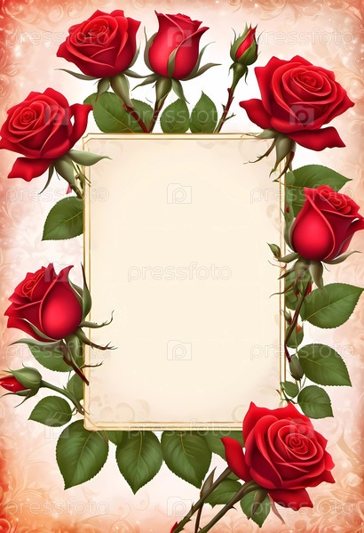 Яркие красные розы элегантно окружают пустое пространство, создавая красивый фон, идеально подходящий для выражения любви, благодарности или специальных сообщений. Идеально подходит для открыток и приглашений