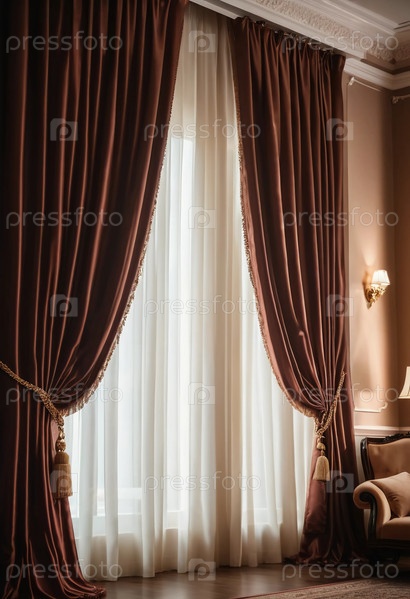 Богатые, дорогие шелковые шторы в глубокой коричневой раме яркое, воздушное окно, повышающее элегантность благоустроенной жилой зоны со вкусным декором и мягким освещением