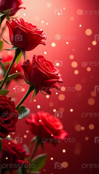 Пышные красные розы цветут страстно, бархатистые лепестки ловят нежный проблеск боке. Очаровательная аранжировка, завораживающая атмосферой, вызывает восхищение. Чистое пространство приглашает сердечные сообщения