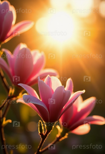 Нежные цветы магнолии, их мягкие розовые лепестки сияют на утреннем солнце, пробуждают сад яркими оттенками. Купаясь в золотом свете, каждый цветок, кажется, танцует с радостью, когда начинается день. ИИ