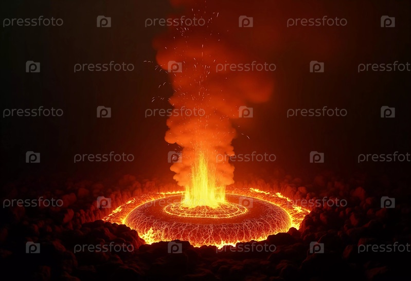 Расплавленная магма извергается со взрывной силой, посылая огненные искры в сумеречное небо. Потрясающее природное явление, захватывающее сырую энергию Земли в движении