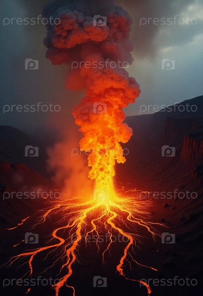 Магма вырывается из вулкана, посылая в воздух шлейфы огненного пепла и реки сверкающей лавы, стекающие вниз по склону горы, когда дневной свет исчезает