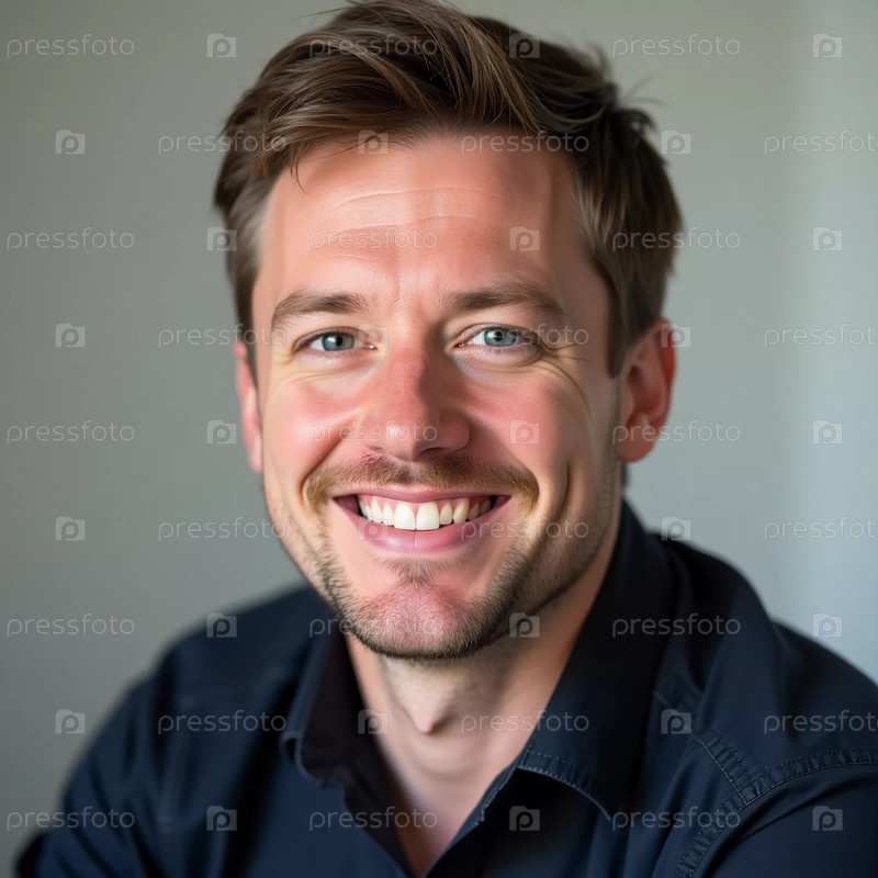 Веселый шведский мужчина со светлыми волосами демонстрирует сияющую улыбку в уютной обстановке в помещении. Его дружеское выражение излучает счастье и тепло, приглашая к соединению Генеративный ИИ