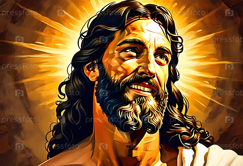 В момент радости улыбающийся Иисус Христос излучает тепло и сострадание, с золотым свечением, освещающим его лицо, символизирующим надежду и божественную любовь в мирной обстановке
