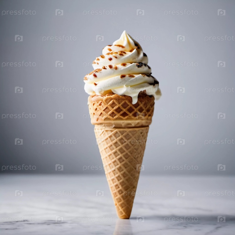 Вкусный мороженый корнет гордо стоит с кремовым вихрем, увенчанным богатой заморозкой.Солнечный свет фильтруется, освещая его восхитительные детали в гостеприимном кафе Generative AI