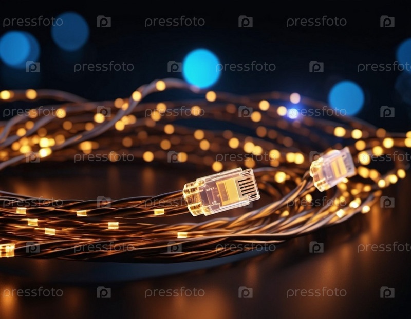 Синие и оранжевые светящиеся провода скручиваются и переплетаются на темном фоне с боке. Черные кабели и разъемы со светящимися огнями и цепями соединяются, чтобы сформировать сеть. генерируемый