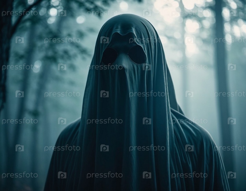 Призрачная фигура в белом листе стоит в тумане. Фигурное лицо затенено листом, но два темных глаза можно увидеть, вглядываясь в ткань. Фон, наполненный закрученным туманом и тенями. Хэллоуин. ИИ
