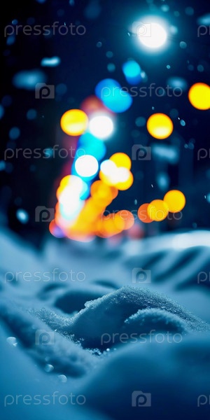 Зима приносит мягкий снегопад на городские улицы, где над головой висят красочные огни, создавая теплую и праздничную атмосферу. Эффект боке от огней добавляет причудливого прикосновения, подчеркивая радость сезона