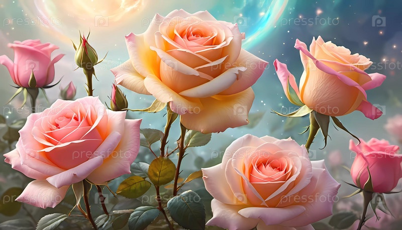 Потрясающая романтическая картина с изящными розовыми и персиковыми розами, цветущими под мягким небесным небом, с сияющим закатом, освещающим сцену. Луна и звезды, вызывающие чувство безмятежности и любви. ИИ