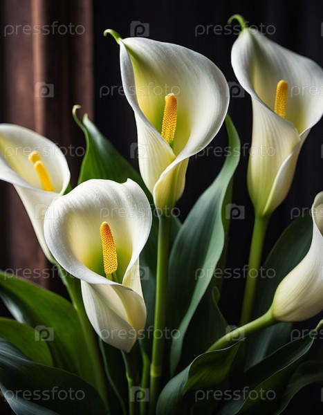 Потрясающий показ белых лилий с яркими желтыми центрами, окруженными пышными зелеными листьями, создает элегантное цветочное расположение, идеально подходящее для любого случая. Генеративный ИИ. Черный фон