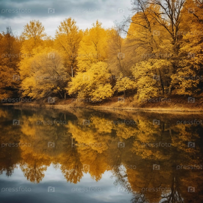 Яркие желтые листья создают потрясающий осенний дисплей вокруг спокойного озера, с отражениями, отражающими листву на поверхности воды, когда день подходит к концу. Генерирующий ИИ