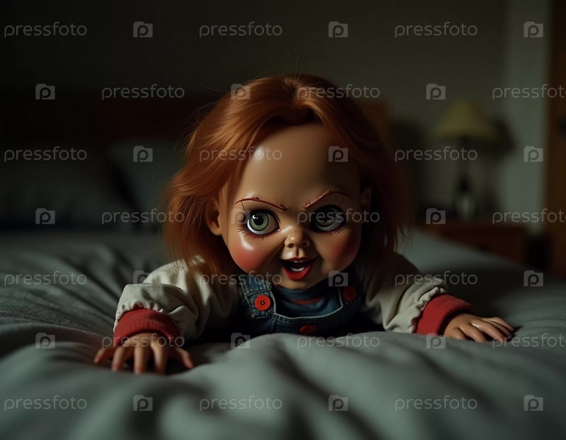 Кукла с преследующими чертами скрывается под кроватью, ее пронзительный взгляд и искривленная улыбка создают леденящую атмосферу в тускло освещенной комнате. Страшная кукла для ужасов и Хэллоуина. Генерирующий ИИ