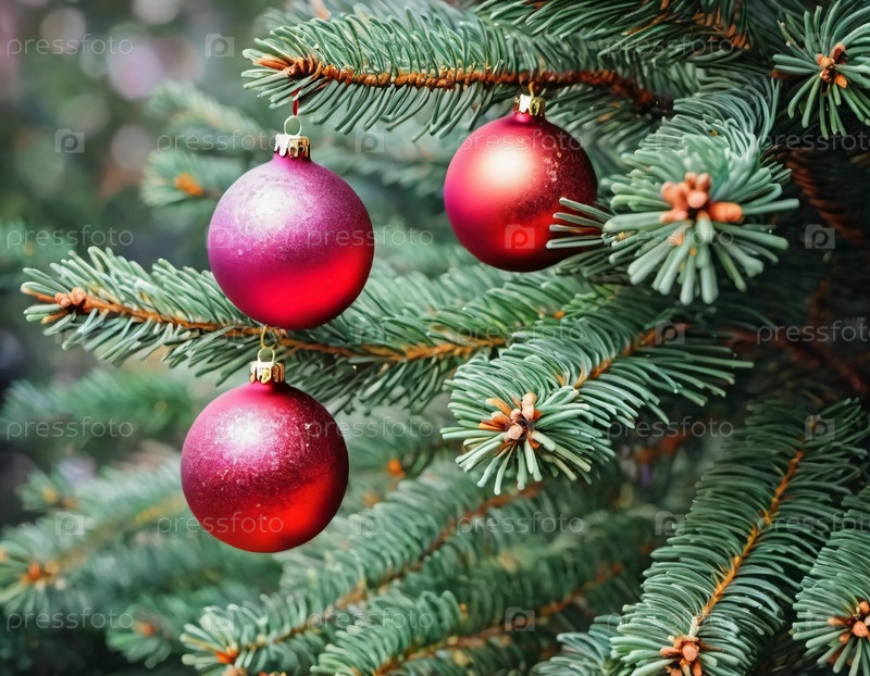 Красочные рождественские украшения украшают ветви елки, яркие шары в оттенках красного и розового, олицетворяющие праздничное настроение зимой. С Новым годом искусство боке фон. Генеративный ИИ