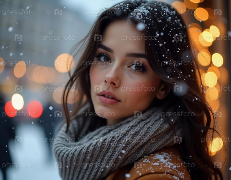 Потрясающая женщина смотрит мягко, когда вокруг нее падают снежинки в восхитительной городской обстановке, захватывая магию рождественского сезона. Красивая брюнетка с длинными волосами. Генерирующий ИИ