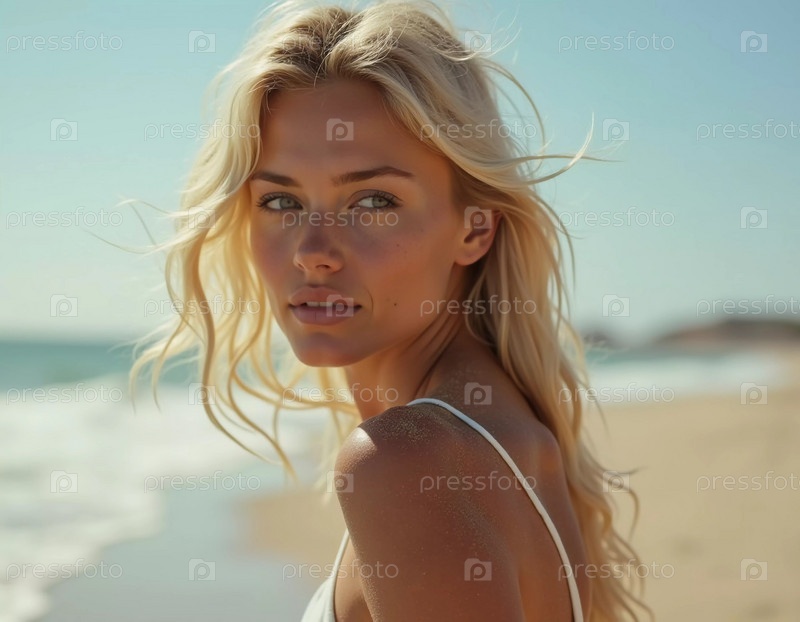 Блондинка в купальнике смотрит назад, стоя у береговой линии. Нежные морские волны лазают у ее ног под ясным голубым небом. Длинные волосы, красивое молодое лицо. Реклама путешествий и одежды. ИИ
