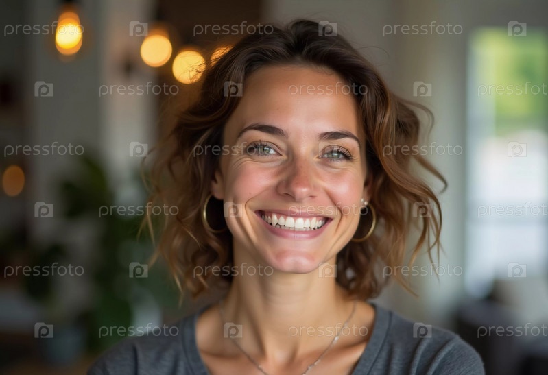 Французская кавказская красивая молодая жительница с волнистыми волосами разделяет подлинную улыбку, стоя в помещении, освещенном естественным светом, создавая притягательную атмосферу. Генерирующий ИИ