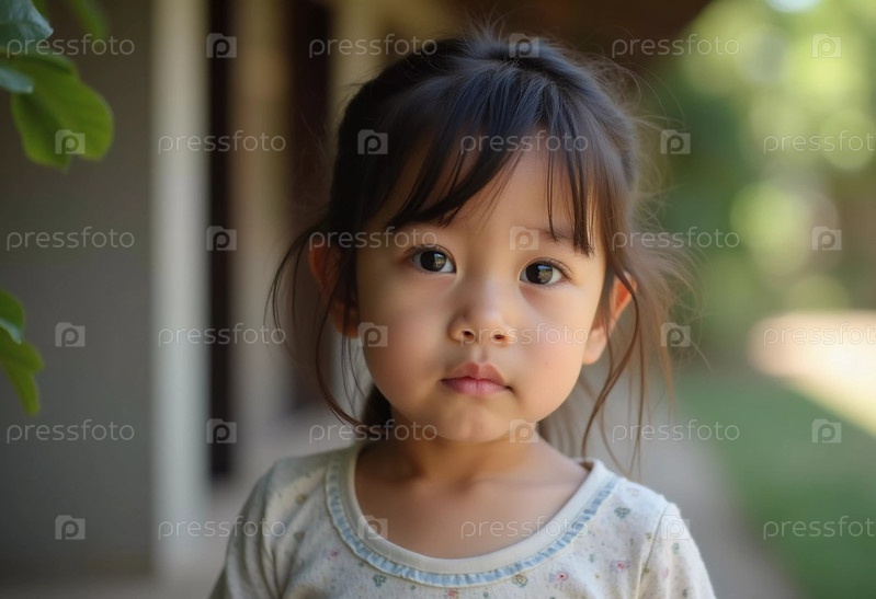 Молодая девушка, проживающая в Таиланде, спокойно стоит в саду, окруженном зеленью. Ее вдумчивое выражение отражает безмятежность внешней среды в светлый день. Генерирующий ИИ