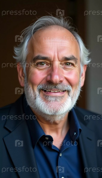 Веселый пожилой мужчина с серебряной бородой и яркой улыбкой делится своей радостью. Одетый в черный костюм, он воплощает мудрость и тепло, установленный на уютном фоне в Израиле в солнечный день