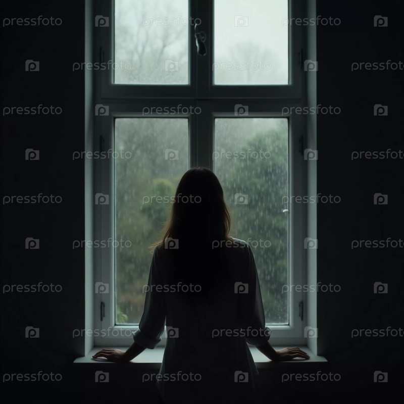Женщина стоит у окна, наблюдая, как на улице мягко выпадает дождь, ее силуэт обрамлен серым светом пасмурного дня. Моменты размышлений охватывают ее генеративный ИИ
