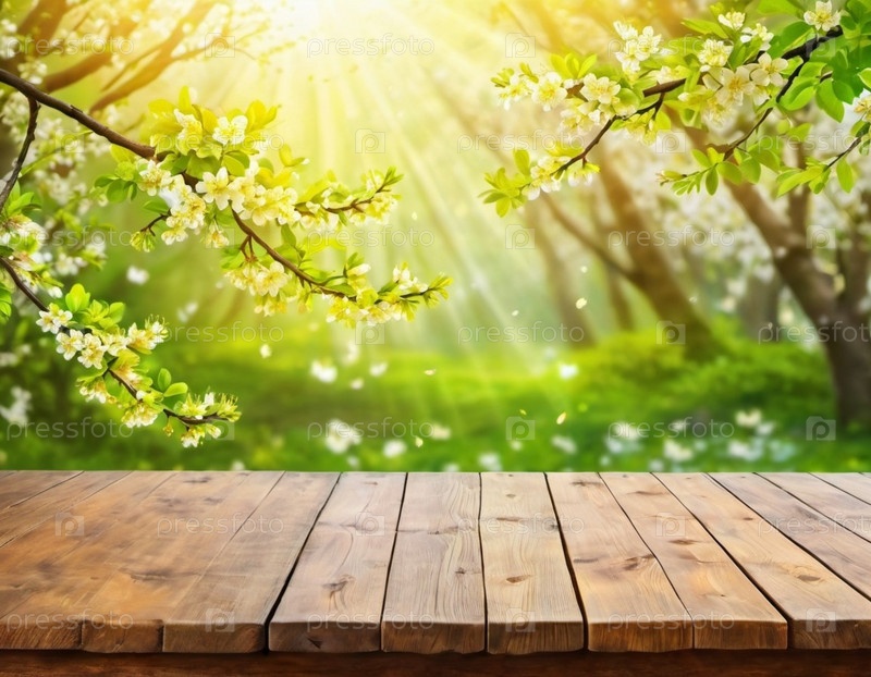 Деревянный стол сидит перед размытым фоном весеннего сада. Желтые цветы на ветке достигают солнца, которое светит сквозь листву. Копирование пространства для демонстрации продукции. ИИ