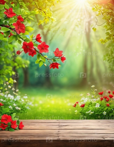 Деревянный стол сидит перед размытым фоном весеннего сада. Красные большие цветы на ветке достигают солнца, которое светит сквозь листву. Копирование пространства для демонстрации продукции. ИИ