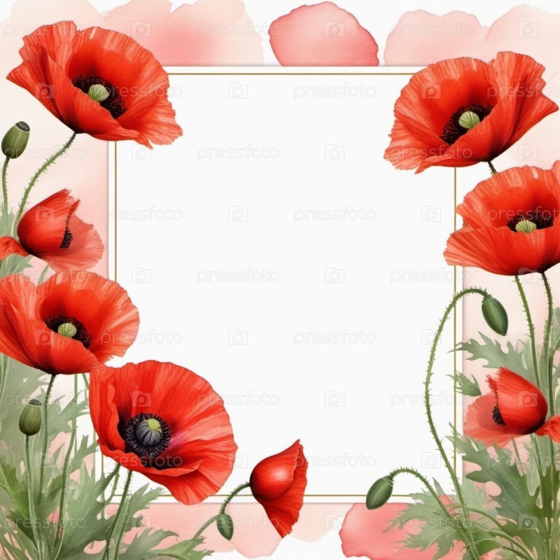 Красные маки с зелеными листьями и стеблями. Маки изображены на различных стадиях цветения, некоторые полностью открыты, а другие в зародыше. Мягкая спина, создающая деликатное и романтическое чувство