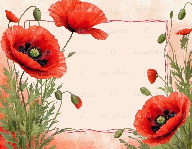 Красные маки, зеленые листья, стебли. Щенки изображены на различных стадиях цветения, причем некоторые полностью открыты, а другие в зародыше. Мягкая спина, создающая нежные романтические чувства. Копируйте пространство. Открытка или макет