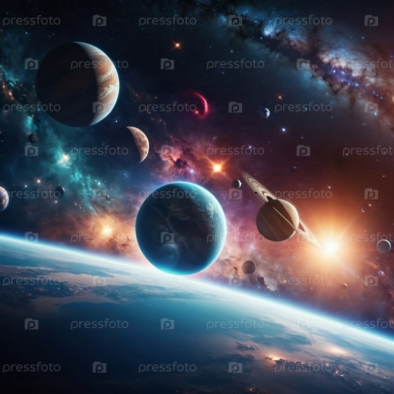 Планетарная система с несколькими планетами, большой ярко окрашенный газовый гигант и скалистая планета. Яркие звезды и обширное пространство темного пространства с галактикой на заднем плане. Космические пространства. Космонавтика. ИИ