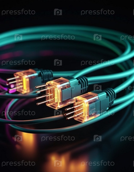 Синие и оранжевые светящиеся провода скручиваются и переплетаются на темном фоне с боке. Черные кабели и разъемы со светящимися огнями и цепями соединяются, чтобы сформировать сеть. генерируемый