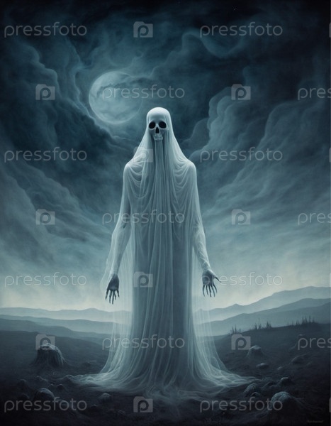 Призрачная фигура маячит на кладбище. Закручивающийся туман. Странная атмосфера. Призрак наряжает протекающее полупрозрачное платье, которое сливается с туманом, создавая тревожный визуальный эффект. Чувство страха и тайны. ИИ