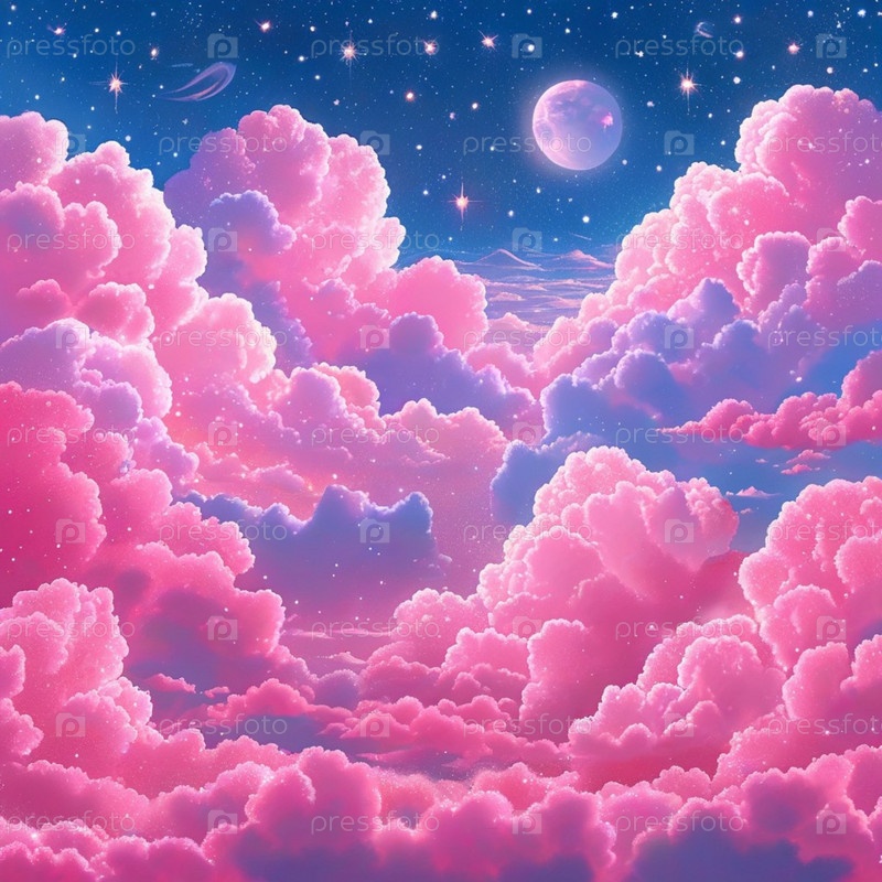 Красивые розовые пушистые облака в ярком закате неба. Визуальный дисплей. Драматические нереальные небеса с кучевыми и стратовыми облаками в атмосфере. Неизвестная планета с розовыми облаками Луна, планеты и звезды. Искусство