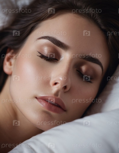 Брюнетка с длинными ресницами мирно спит на кровати, демонстрируя безмятежный момент в ранние утренние часы. Женщина-брюнетка крепко спит на подушке. Спокойствие и спокойствие. Искусство. Утро